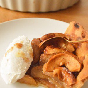 Esta receta viene del lado de la familia de Patrick, insistió en que debía probar esta tarta en vez del pastel de manzana tradicional con dos masas; un día lo hice y era tan ligero y delicioso y pegajoso por todo el caramelo que tenía, que realmente no he vuelto a hornear un pastel tradicional de nuevo! Así que confíen en mí para esta receta!