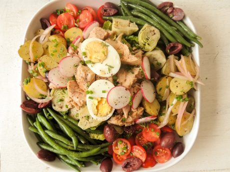 For the salad: Toss the lettuce leaves with a very little bit of the dressing and arrange on a platter. Toss the green beans, potatoes, tomatoes and artichoke hearts separately in a bit of dressing, and arrange on the platter. Scatter the onions and olives on top. Arrange the eggs and tuna on top. Season with freshly ground sel de guerande and pepper.